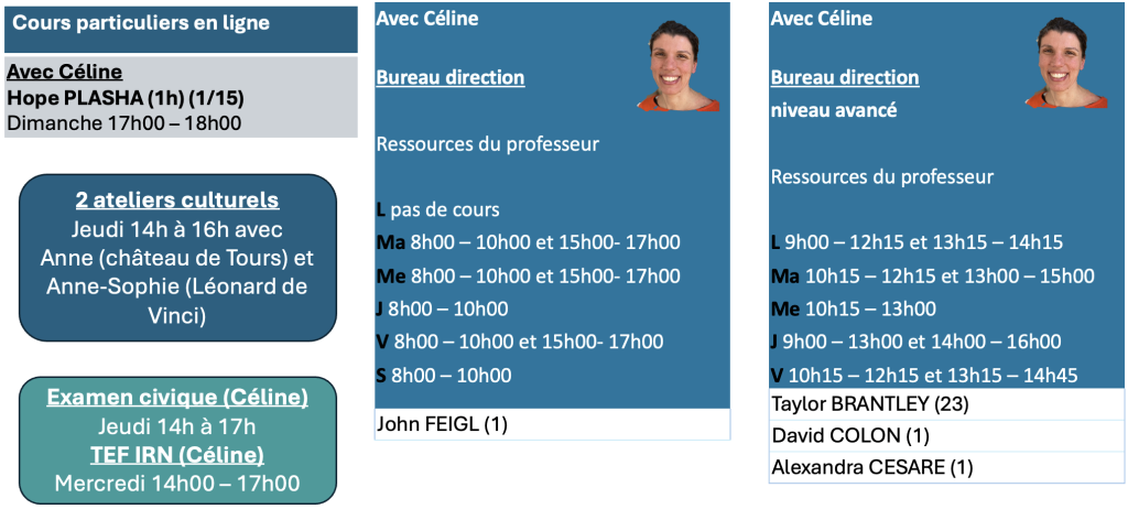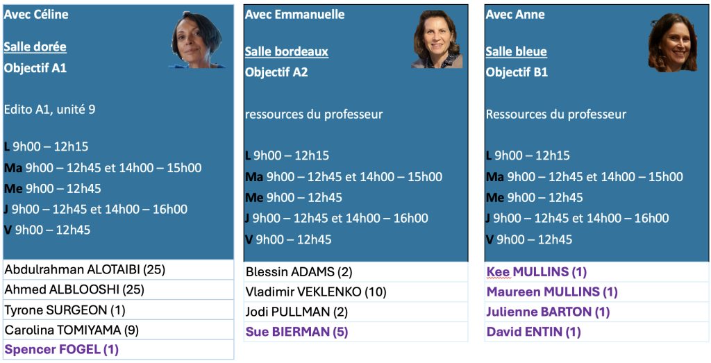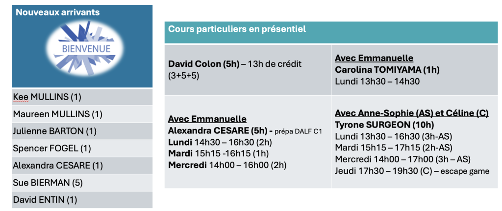 Vous trouverez votre planning de cours ci-dessous. Cette semaine, vous pourrez participer à un dîner à la Maison Gloria le mercredi soir.